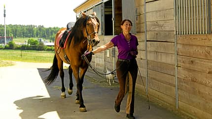 Bestimmen Sie die richtige Perspektive. „Wenn Sie bei einem Pferd die Gänge zeigen wollen, macht es wenig Sinn, es von vorne zu filmen“, sagt Armin Ulrich. „Filmen Sie es von der Seite von einem festen Standort aus.“ Genau umgekehrt ist es, wenn Sie beispielsweise Schulterherein oder eine Traversale filmen wollen. „Das müssen Sie von vorne oder im Fall der Traversale von schräg vorne aufnehmen, sonst sieht ja niemand, ob das Pferd auf zwei Hufschlägen geht oder die Beine korrekt kreuzt“, sagt Ulrich. Damit die Aufnahme nicht verwackelt, empfiehlt er ein Stativ und eine ruhige Hand. „Folgen Sie der Bewegung langsam und gleichmäßig, sonst ruckelt es im Film.“