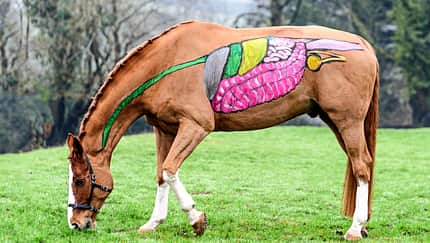 Katrin Obst (links) ist Physiotherapeutin für Pferde und erklärt Anatomie auf anschauliche Art. Ihre Mitarbeiterin Anne Badenberg (rechts) pinselte für die neue CAVALLO-Serie mit Fingermalfarbe Skelette, Muskeln, Blutgefäße & Co. auf die Tiere. Übrigens: Die Farbe ist ungiftig und lässt sich leicht wieder aus dem Fell bürsten. www.katrinobst.de
