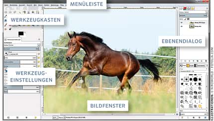 Bevor Sie Ihre Pferdebilder bearbeiten, benötigen Sie eine Software. Professionelle Bildbearbeitungsprogramme sind oft teuer. Es gibt jedoch kostenlose Alternativen. Manche haben nur wenige Funktionen und sind für Einsteiger geeignet, andere so umfangreich, dass sie mit Profi-Software mithalten können. Wir haben uns bei dieser Einführung in die Bildbearbeitung für die beliebte Freeware Gimp entschieden (siehe Foto), um zu zeigen, wie Sie Ihre Bilder einfach aufbessern können. Das Programm gibt es kostenlos unter: www.gimp.org