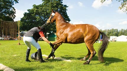 Springt das Pferd vor Schreck zur Seite oder flüchtet rückwärts, beginnen Sie von vorne. Beginnen Sie immer mit leichten Übungen, die Sie steigern. Wichtig ist, dass Sie das Pferd weder überfordern noch bestrafen. Wie das Pferd vom Knistern darf sich der Führer nicht von der Reaktion des Pferds beeindrucken lassen. Zeigt er Angst, überträgt sich das aufs Pferd. „Es möchte sich dann erst recht nicht der unheimlichen Flasche auf dem Boden nähern“, erklärt Oswald.