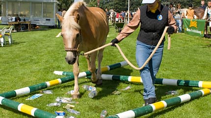 Besonders fies: Der Lärm geht hinterm Pferd los. Das ist eine besondere Herausforderung, da das Pferd durch sein eingeschränktes Sehen Geräusche von hinten nicht orten kann. In der Prüfung soll das Pferd trotz Krach am losen Strick ruhig in der Markierung stehenbleiben. Damit nicht gleich die erste Aufgabe danebengeht, muss das Pferd in kleinen Schritten an die Klapperkarre gewöhnt werden. „Da die Richter ein ruhig stehendes Pferd sehen wollen, muss auch das Stillstehen zu Hause geübt werden“, sagt Klaus Harms aus Hiddenhausen in Nordrhein-Westfalen.