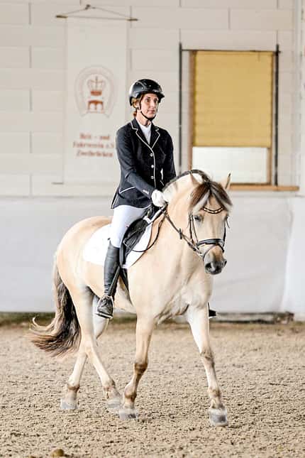 Inzwischen kann ich ohne Sattel und nur mit Halfter mit ihm ausreiten und fühle mich in jeder Gangart so sicher, als würde er auf mich aufpassen. Auch in der Dressur macht Peppi eifrig mit. So entscheide ich kurzentschlossen, meinen Traum endlich wahrzumachen, und melde mich beim Fjord-Cup an: für eine E- und eine A-Dressur.