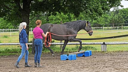 Übung 1: Belastet das Pferd ein Bein mehr oder weniger? Lassen Sie es dafür mehrmals über ein Cavaletti (ca. 20 cm hoch) traben.